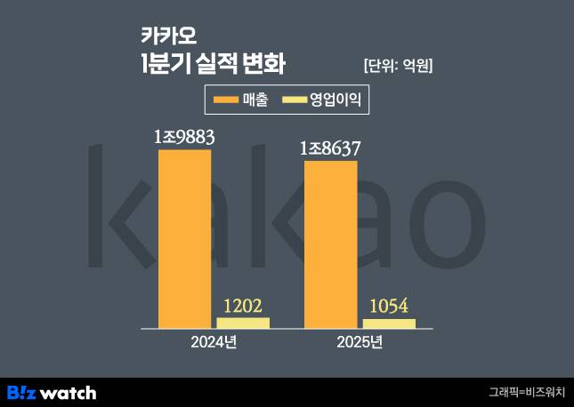 카카오는 올해 1분기 연결 기준 매출이 전년 동기보다 6.3% 감소한 1조8637억원, 영업이익은 12.4% 줄어든 1054억원으로 잠정 집계됐다고 8일 공시했다. 이는 에프앤가이드가 집계한 컨센서스(증권사 전망치 평균)인 매출 1조9351억원, 영업이익 1057억원을 모두 밑돈 수치다.