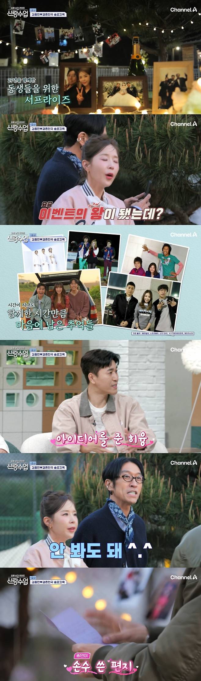 코요태 멤버들은 김종민이 준비한 과거 사진에 푹 빠졌고 김종민은 "내가 (코요태) 축사에 답장을 하고 싶다고 했더니 히융(아내)이가 이런 걸 이벤트 하면 어떠냐고 했다"며 이벤트가 아내의 생각임을 전했다.