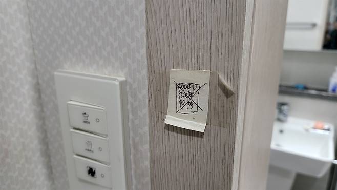 | ▲ 스마트폰 금지 화장실에서 휴대폰 사용 금지라며 아이가 붙여놓은 귀여운 경고판. 집 안 곳곳에 있다.] |