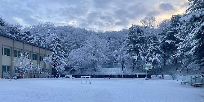 | ▲ 고양자유학교 겨울 풍경 이른 아침 일찍 출근한 선생님이 찍은 첫 눈 내린 학교 풍경 |