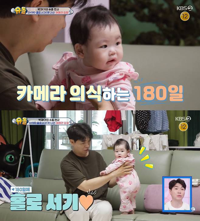 생후 180일, 박수홍은 "이제 다리 힘이 세져서 혼자서 선다"라며 흐뭇해 했다. 그러면서 카메라를 똑바로 보는 딸에 "우리 재이는 걸그룻 수준으로 카메라를 좋아한다. 카메라를 잡아먹는다"라 했다