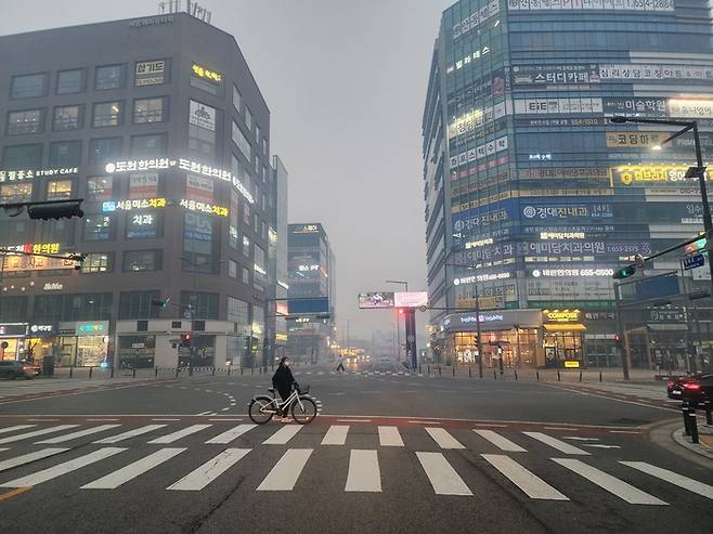 지난 달 26일 경북 북부지역을 덮친 대형 산불로 예천군 호명읍 도청신도시 중심상가가 연기에 덮혀 있는 가운데 마스크를 착용한 주민이 자전거를 타고 급히 이동하고 있다. <독자 제공>