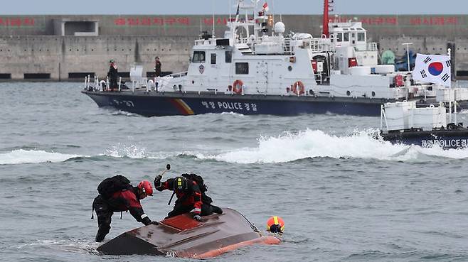 ▲ 지난 2023년 '레디 코리아'(READY Korea) 훈련에서 해경이 전복된 어선을 두드리며 생존자를 수색하고 있다.