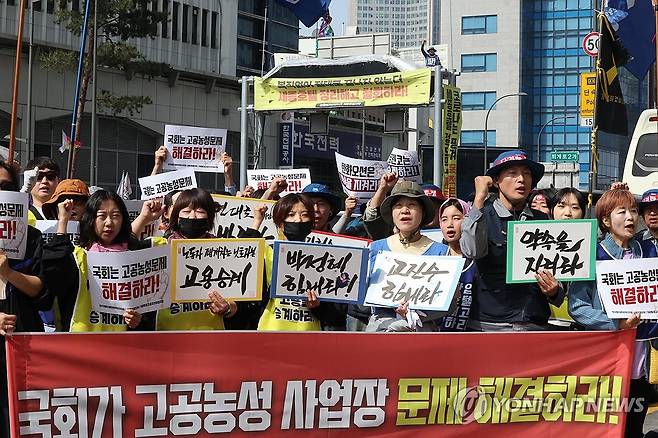 (서울=연합뉴스) 이진욱 기자 = 한국옵티칼하이테크지회, 세종호텔지부, 거제통영고성조선하청지회 등 고공농성 3개 사업장 노조원들이 8일 서울 명동 세종호텔 고공농성장 앞에서 국회에 대해 고공농성 사업장 문제 해결을 촉구하고 있다. 2025.5.8