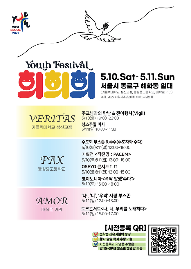 WYD 지역조직위(위원장 정순택 대주교)는 8일 “올해 성소주일(부활 제4주일)을 맞아 10, 11일 서울 종로구 가톨릭대 성신교정, 동성 중고교, 대학로 거리 등에서 유스 페스티벌 ‘희(熙)희(喜)희(希)’를 개최한다”라고 밝혔다. ‘희희희’에서는 2027년 서울 WYD의 영적 지향인 ‘진리(Veritas)’ ‘평화(Pax)’ ‘사랑(Amor)’을 주제로 다양한 전례, 공연, 체험 부스, 전시 프로그램이 선보인다. 개그맨 곽범의 사회로 진행되는 대학로 특설 무대에서는 아이돌 그룹 ‘파우’ 가수 백아연, 펀치, 임한별 등이 출연하는 토크 콘서트와 공연이 펼쳐진다. 또 천주교, 불교, 개신교, 원불교 등 종교 지도자로 구성된 ‘만남 중창단’의 공연도 볼 수 있다.