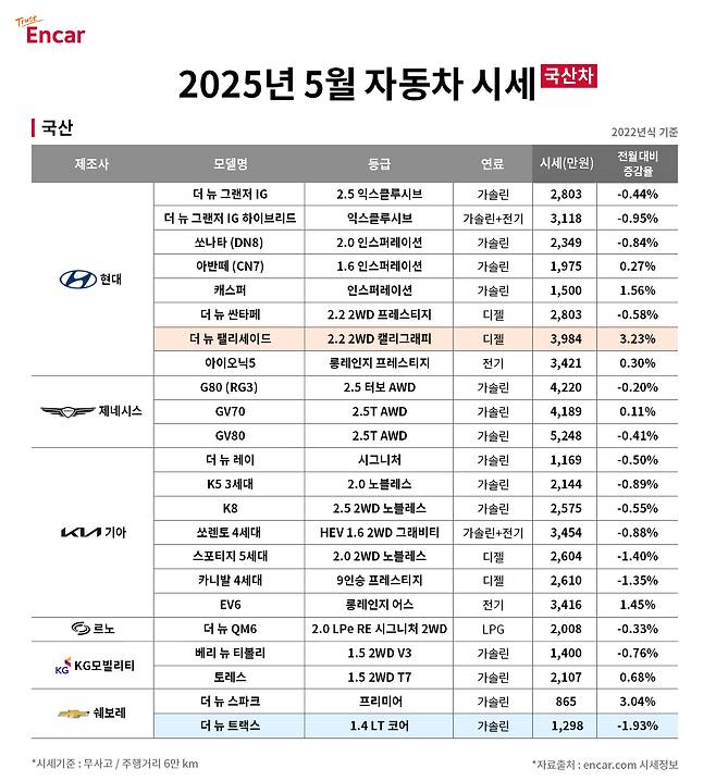 8일 엔카닷컴이 발표한 2025년 5월 중고차 시세 데이터에 따르면 국산·수입차 브랜드의 주요 차종 중고차 시세는 0.46% 상승했다(2022년식 6만㎞ 무사고 기준). 가정의달에 연휴까지 껴있어 지출이 늘며 중고차 수요가 다소 주춤하는 통상적인 흐름과는 대비된다.