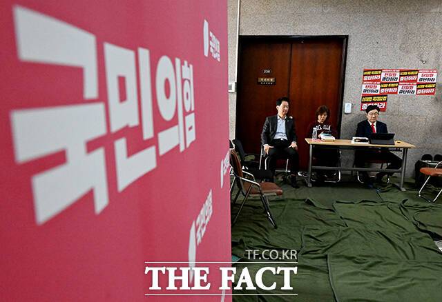 [더팩트ㅣ국회=배정한 기자] 권성동 국민의힘 원내대표가 8일 오전 서울 여의도 국회 원내대표실 앞에서 김문수 당 대선 후보와 한덕수 무소속 대선 예비후보 간 단일화를 촉구하는 단식 농성을 이어가고 있다.