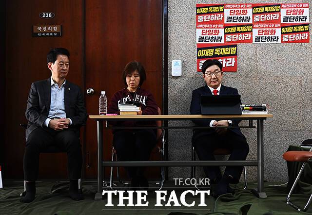 '단식 농성' 이어가며 김문수 관훈클럽 토론 시청하는 권성동 원내대표 [TF사진관]