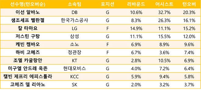 켐바오가 팀에서 차지하는 어시스트 비율은 8.9%. 그가 정규리그 초반부터 꾸준한 경기력을 보였다면, 팀 내 어시스트 비율은 23.0%까지 오른다. 이는 벨란겔(26.3%)과 유사한 수치며, 켐바오의 가치가 단순히 득점에 국한되지 않는다는 것을 증명한다.