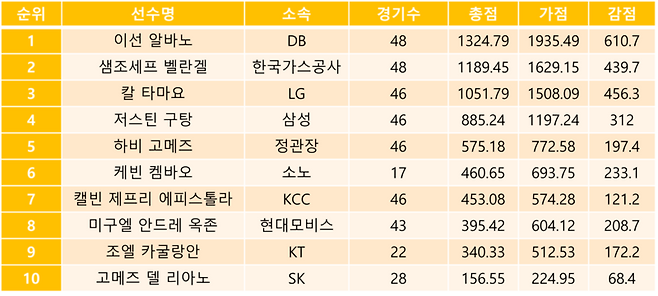 공헌도가 가장 높은 선수는 알바노다. 알바노는 총점 1324.79점으로 2위 벨란겔(1189.45점)보다 135점 이상 높다. 1위와 2위의 차이는 아시아쿼터 선수 공헌도 최하위인 고메즈 딜 리아노(156.55점)와 비슷하다. 즉, 벨란겔과 고메즈를 합친 수준이라는 것.