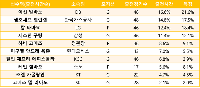 아시아쿼터 선수들을 팀 득점에서 차지하는 비율순으로 나열하면 <알바노-타마요-벨란겔-구탕-하비 고메즈-켐바오-옥존-카굴랑안-에피스톨라-고메즈 델 리아노>와 같다. 출전 시간 대비 득점 비율이 높은 선수를 추리면, 알바노-타마요-벨란겔-구탕-하비 고메즈-켐바오 등 6명이다.