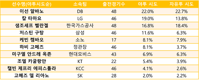 앞서 아시아쿼터 선수들이 팀 득점에서 차지하는 비율순은 <알바노-타마요-벨란겔-구탕-하비 고메즈-켐바오-옥존-카굴랑안-에피스톨라-고메즈 델 리아노>라고 소개한 바 있다. 이는 야투 시도 비율과 거의 유사했다. 켐바오와 하비 고메즈만이 순위를 바꿨을 뿐, 나머지 선수들은 팀에서 차지하는 득점 비율만큼 슛을 시도했다.