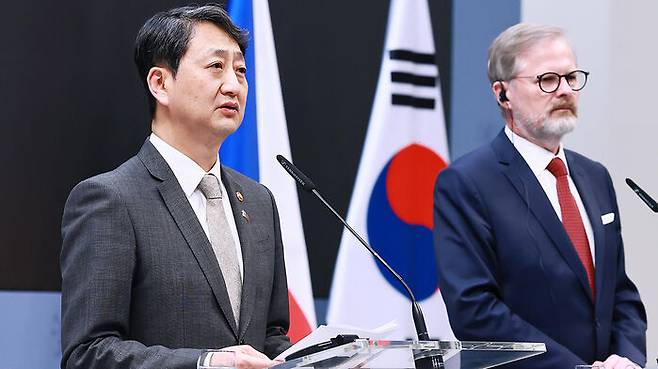 ▲ 안덕근 산업통상자원부 장관(왼쪽)이 7일 프라하 체코 총리실에서 페트르 피알라 체코 총리를 비롯한 한국과 체코 정부 대표단이 참석한 가운데 열린 한ㆍ체코 원전산업 협력 약정(Arrangement) 체결식에서 약정서에 서명한 뒤 발언하고 있다.