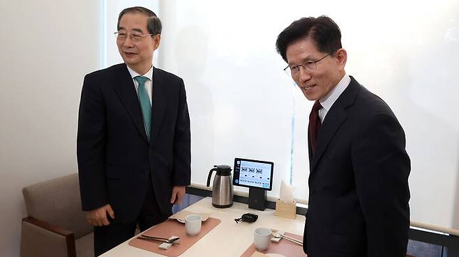 ▲ 국민의힘 김문수 대선후보(오른쪽)와 무소속 한덕수 대선 예비후보가 7일 서울 종로구의 한 식당에서 후보 단일화 관련 회동을 하고 있다.
