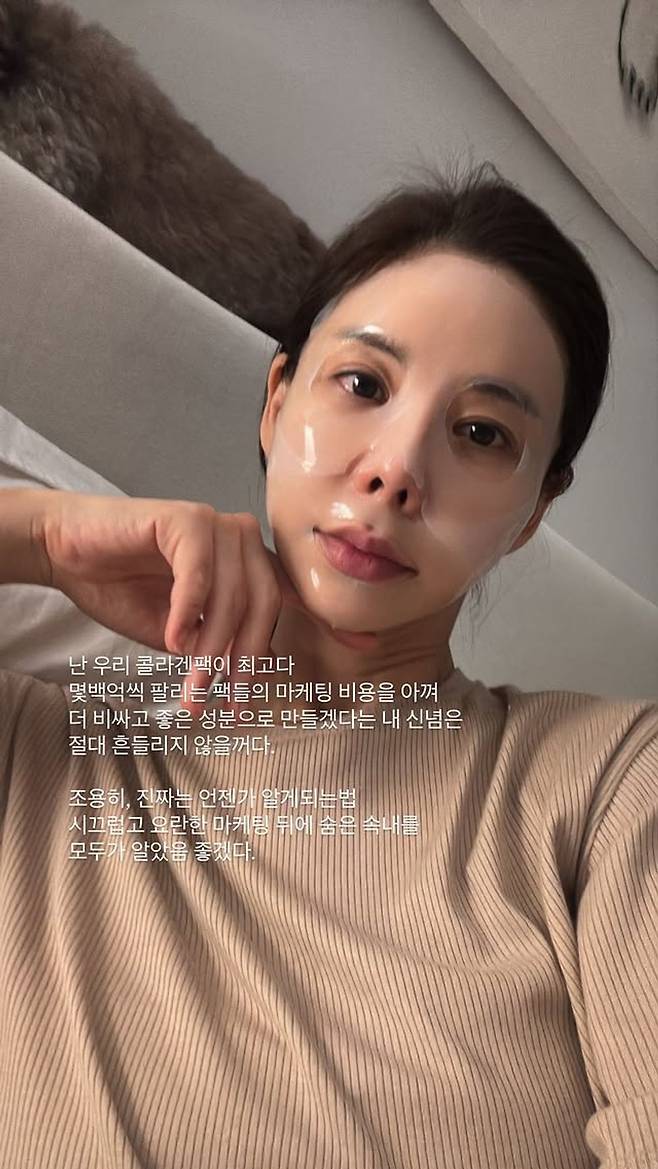 그는 "난 우리 콜라겐팩이 최고다"고 운을 떼며 "몇백억씩 팔리는 팩들의 마케팅 비용을 아껴 더 비싸고 좋은 성분으로 만들겠다는 내 신념은 절대 흔들리지 않을 거다"라고 단호하게 밝혔다.