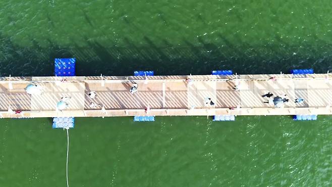 | ▲ 백제문화제가 열리는 28일, 공주 공산성 앞 금강은 녹조가 창궐했다.(녹조가 핀 금강을 가로지른 부교를 건너는 주민들) |