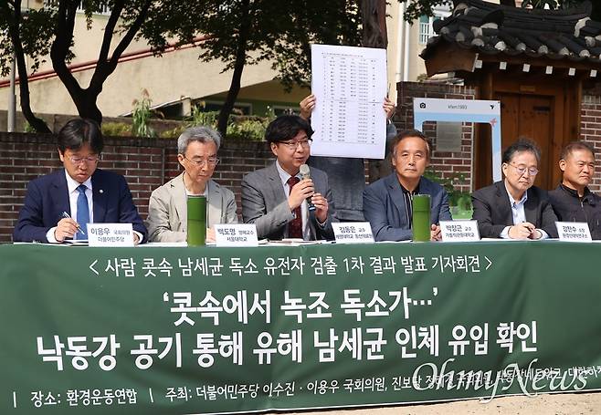 | ▲ 7일 오전 서울 종로구 환경운동연합 마당에서 '콧속에서 녹조 독소가 - 낙동강 공기 통해 유해 남세균 인체 유입 확인 기자회견'이 민주당 이용우 의원, 진보당 정혜경 의원, 낙동강네트워크, 대한하천학회, 환경운동연합 주최로 열렸다. |