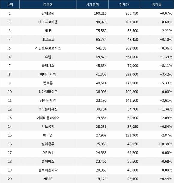 한편 시가총액 20위권 종목들은 삼천당제약(000250) ▲2.61%, 코오롱티슈진(950160) ▲1.34%, 에이비엘바이오 ▼2.09%, 리노공업(058470) ▲0.54%, 에스엠(041510) ▼2.87%, 실리콘투(257720) ▲10.38%, JYP Ent.(035900) 0.00%, 펄어비스(263750) ▼0.68%, 셀트리온제약(068760) 0.00%, HPSP(403870) ▲0.44% 등의 성적을 기록하고 있다.
