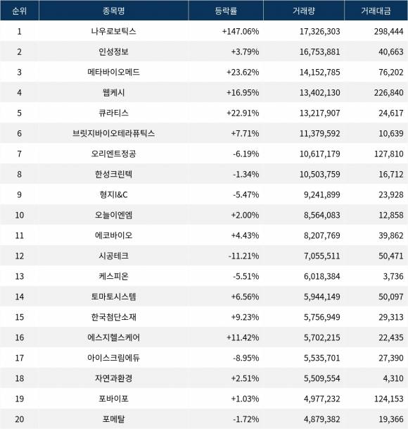 한편 거래량 상위 20위권 종목들은 에코바이오(038870) ▲4.43%, 시공테크(020710) ▼11.21%, 케스피온(079190) ▼5.51%, 토마토시스템(393210) ▲6.56%, 한국첨단소재(062970) ▲9.23%, 에스지헬스케어(398120) ▲11.42%, 아이스크림에듀(289010) ▼8.95%, 자연과환경(043910) ▲2.51%, 포바이포(389140) ▲1.03%, 포메탈(119500) ▼1.72% 등의 성적을 기록했다.