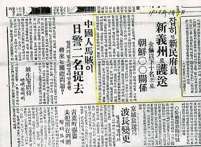 | ▲ 일본군에 체포된 김혁 장군을 비롯한 신민부원을 호송한다는 기사가 실린 신문. 1928년 3월자. |