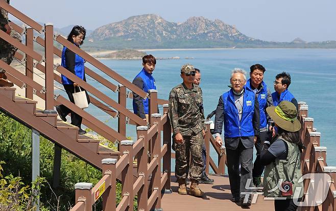 (서울=뉴스1) 이연주 기자 = 유인촌 문화체육관광부 장관이 8일 강원도 고성군 통일전망대에서 시작되는 고성 DMZ 평화의 길 테마노선을 걷고 있다. (문화체육관광부 제공. 재판매 및 DB 금지) 2025.5.8/뉴스1