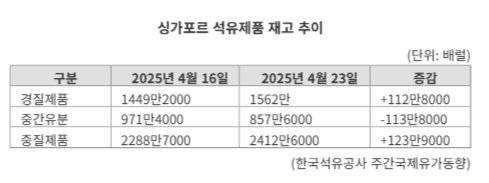 아시아 정제 수익성의 핵심 지표인 싱가포르 경질유(휘발유 등)와 중질유(LSFO·벙커유) 재고가 동반 급증하면서 국내 정유업계에 '마진 경고등'이 켜졌다.