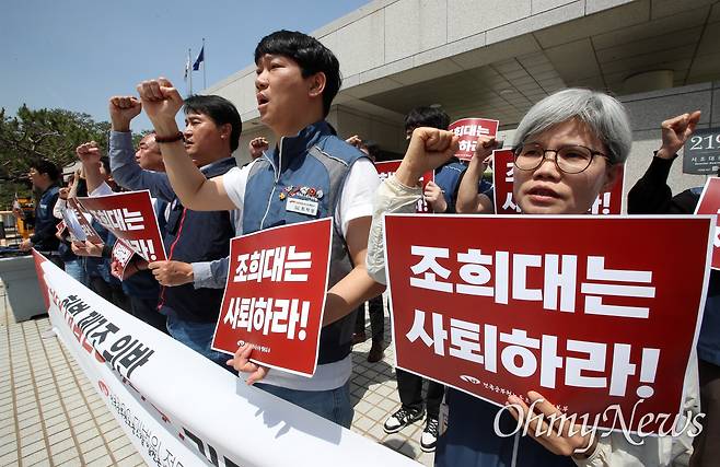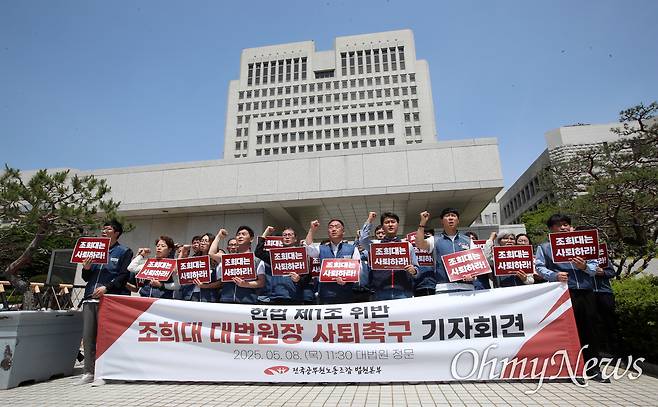 8일 전국공무원노동조합 법원본부는 서울시 서초구 대법원 정문 앞에서 기자회견을 열고 "헌법 제 1조를 위반한 조희대 대법원장은 사퇴하라"고 외쳤다. 이성민 본부장은 "법원공무원들이 대법원장의 사퇴를 요구하는 게 쉬운 일이겠나. 그런데 왜 이런 사태까지 이르렀나"라며 "조희대 대법원장을 포함해 10명의 대법관들이 절차적 공정성을 전혀 지키지 않았고, 이번 판결을 통해 조희대 대법원장이 다음 대통령을 정하려고 했다는 확신을 국민들에게 주고 있기 때문"이라고 말했다.