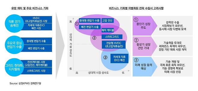 비즈니스 기회를 실현하기 위해 국내 기업은 기술과 시장 관점에서 고투마켓(Go-To-Market) 전략을 차별화되게 수립해야 한다. 우선, 현재 전력 시장의 성장을 주도하고 있는 변압기, 고압전선, 해저케이블의 경우 미국을 강력한 수출 시장으로 확보하는 동시에 시장 다변화에 박차를 가해야 한다. 이러한 전력 인프라는 기간 산업에 속하므로 각국 정부와 긴밀하게 협업하는 환경 조성도 필요하다. 또한 중장기 관점에서 전력 시장의 성장을 견인할 것으로 보이는 스마트그리드, 전압형 HVDC 시장에서는 국내 사업을 중심으로 실증 경험을 충실히 쌓고 이를 레버리지 하여 해외 시장을 개척해야 한다. 해외 프로젝트를 위해 국내외 전략적 파트너십 구축은 필수다. 마지막으로 미래 먹거리로 육성해야 하는 직류 배전 시장에서는 글로벌 경쟁력 확보를 위해 기술 개발 및 국제 표준을 획득하는 것이 관건이다.