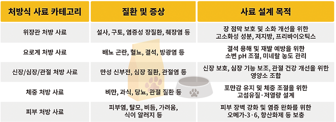 처방사료는 반려동물의 질환을 관리하기 위해 특수하게 설계돼 있습니다. 대표적으로 펫푸드 브랜드 로얄캐닌의 제품이 있습니다. 로얄캐닌은 지난 50여년간 500명의 수의사, 영양 전문가들이 반려동물이 앓는 소화계, 요로계, 체중, 피부질환, 신장, 심장, 관절 등 주요 증상을 연구한 결과를 토대로 반려견 45종, 반려묘 32종을 위한 처방사료를 생산하고 있습니다.