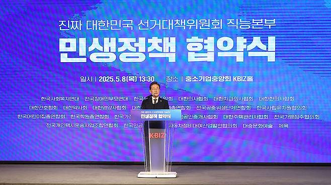▲ 더불어민주당 이재명 대선 후보가 8일 서울 여의도 중소기업중앙회에서 열린 '진짜 대한민국 선거대책위원회' 직능본부 민생정책 협약식에서 발언하고 있다.