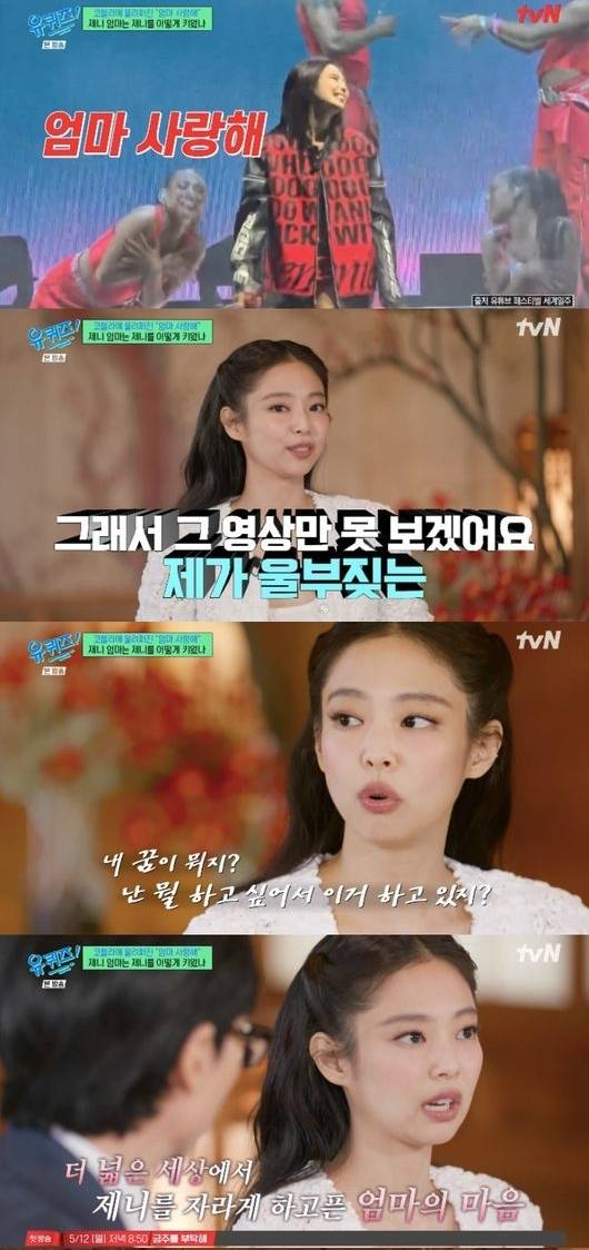 앞서 자신의 원동력으로 어머니를 꼽기도 했던 제니는 이날 방송에서도 어머니를 향한 애정을 아낌없이 드러냈다. 앞서 코첼라 무대에서 ’Starlight’를 부르던 중 “엄마 사랑해” 외치며 울컥했던 모습 보이기도 한 제니는 “저 진짜 약속했다. 안 울려고. 막곡인데 엄마가 보고 있으니까 ‘꾸아앙’ 이러고 나왔다. 그 영상만 못 보겠다. 제가 울부짖는. 너무 울부짖고 있길래”라고 당시를 회상했다.