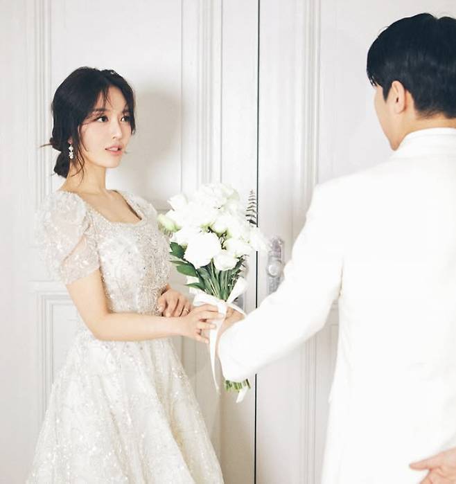 함께한 사진에서 도화는 웨딩드레스를 입고 예비 신랑과 포즈를 취하고 있다.