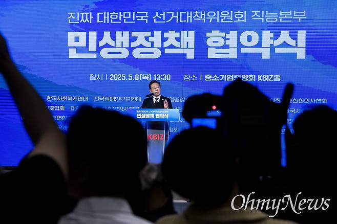 | ▲ 이재명 더불어민주당 대선 후보가 8일 오후 서울 영등포구 중소기업중앙회에서 ‘진짜대한민국 선거대책위원회 직능본부’가 주최한 민생정책 협약식에 참여해 발언을 하고 있다. |
