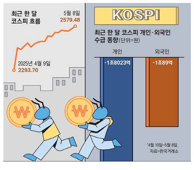 '상호관세 쇼크'에 흔들린 코스피가 2600선 앞까지 회복했지만 개미들은 외국인보다 거센 '셀 코리아'에 나서고 있다.