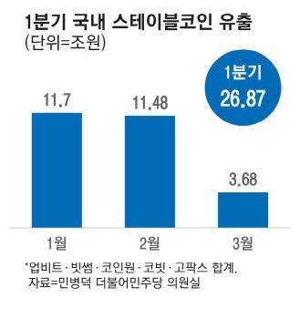 올해 1분기 국내 가상자산거래소에서 해외로 전송된 가상자산 중 절반은 스테이블코인인 것으로 나타났다.