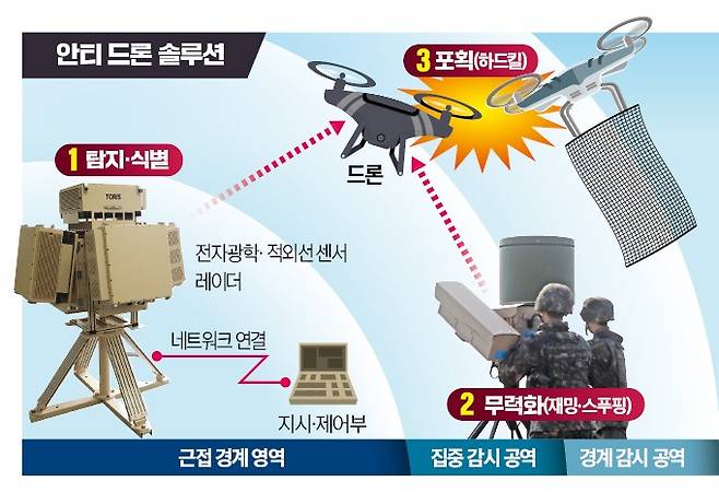안티드론 체계는 크게 세 단계로 구성된다. 먼저 드론을 탐지·식별하고 전파 방해(재밍), 신호 조작(스푸핑) 등으로 무력화한다. 마지막으로 레이저로 드론을 추락시키거나 그물망 등으로 포획한다.