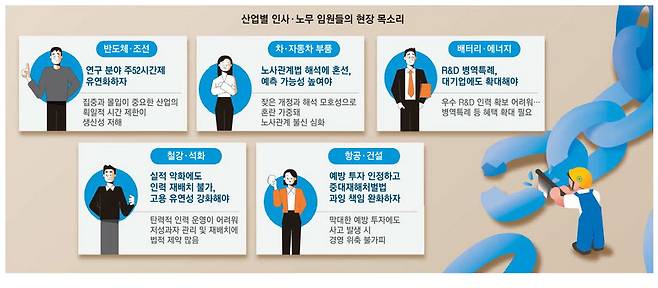 주52시간제는 가장 큰 걸림돌이다. 최근 발주가 급증한 조선업계와 방산업계는 주52시간제 적용으로 야간·주말 작업이 제한돼 생산 일정 관리에 어려움을 겪고 있다. 건설업계 역시 공사기간을 맞추기 위해 집중 작업이 필요한 시점에 근로시간 규제로 애로 사항이 많다. 특히 글로벌 기술 패권전쟁의 최전선인 반도체업계는 일부만이라도 주52시간제 예외를 허용해달라고 지속적으로 요청하고 있다.