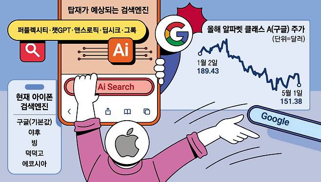 애플이 아이폰의 기본 검색엔진을 구글에서 인공지능(AI) 기반 타사 서비스로 변경할 것이라는 전망에 구글의 위상이 흔들릴 것이라는 예상이 제기됐다. 이 여파로 국내에서도 네이버·카카오와 같은 인터넷 기업 주가가 하락세를 보였다.