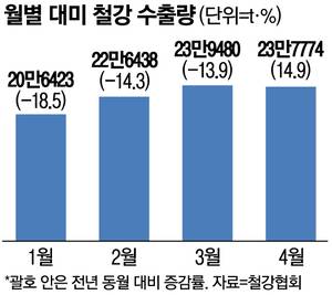 8일 한국철강협회에 따르면 올해 4월 대미 철강 수출량은 23만7774t으로 작년 동월(20만6916t)에 비해 14.9% 증가했다. 지난 3월에는 수출량이 23만9480t으로 전년 동월 대비 13.9% 감소했는데, 4월은 반등에 성공했다.