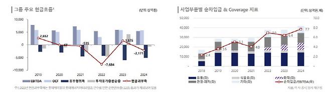 류 연구원은 사업 확장으로 인한 재무부담을 감안해 현금창출력과 투자자금 소요 사이의 균형을 점검할 필요가 있다고 조언했다. 류 연구원은 “M&A, 신사업 투자, 기존사업 CAPEX 지출이 지속되며 그룹 합산 차입금이 큰 폭으로 증가했다”며 “재무부담은 적절히 통제할 수 있지만 예정된 투자 규모가 상당해 그룹 차입 부담이 빠르게 완화되긴 어렵다”고 했다.