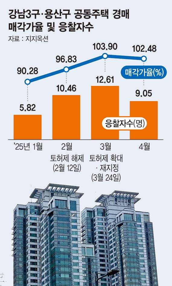 이처럼 강남에서 초고가 낙찰이 쏟아져 나오는 것은 토지거래허가구역 제도와 무관치 않다는 관측이다. 경매는 토허제 허가 대상에서 제외돼 실거주 2년 의무에서 자유롭다. 지난 2월 토허제가 해제되고 3월 강남3구·용산구로 확대 재지정 되는 과정에서 투자자들이 경매 시장으로 눈을 돌린 사실은 매각가율과 경쟁률로도 나타난다. 지지옥션에 따르면 강남3구·용산구의 평균 매각가율은 △1월 90.28% △2월 96.83% △3월 103.90% △4월 102.48%로 상승했다. 평균 응찰자수도 △1월 5.82명 △2월 10.46명 △3월 12.61명 △4월 9.05명으로 2~3월에 특히 증가했다.