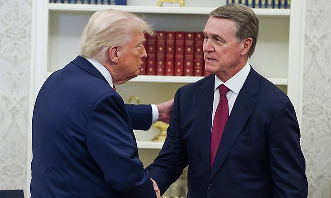 | 트럼프, 주중대사와 악수 도널드 트럼프 대통령(왼쪽)이 7일(현지시간) 미국 워싱턴 백악관 집무실에서 데이비드 퍼듀 주중 미국대사와 악수하고 있다. 워싱턴=UPI연합뉴스 |