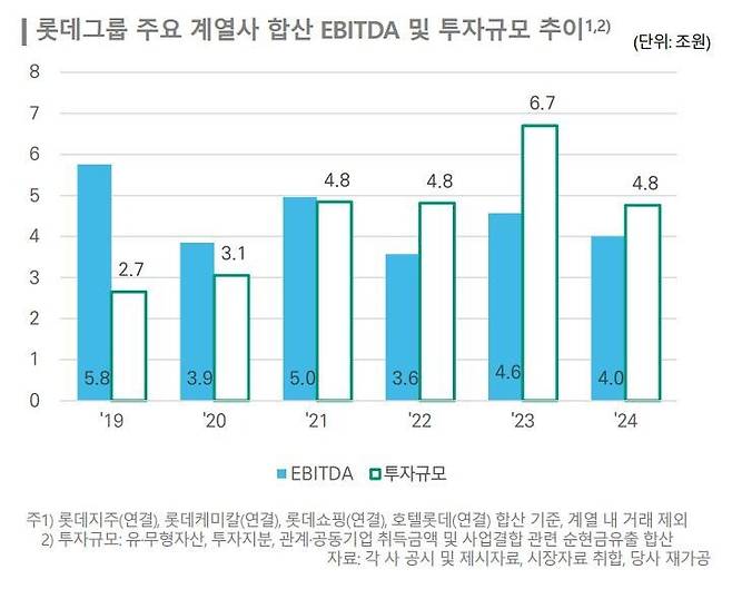 여기에다 들어간 돈에 견줘 벌어들이는 돈은 이에 미치지 못하고 있는 점도 한신평이 주목하는 대목이다. 그룹계열사 합산 신규투자 규모는 2022년 4조8천억원, 2023년 6조7천억원, 2024년 4조8천억원에 이른다. 이 기간 그룹 전체 계열사가 벌어들인 상각 전 영업이익(3조6천억~4조6천억원)을 크게 웃돈다. 한신평은 “2022년 이후 롯데케미칼 중심으로 화학 및 2차 전지 부문(일진머티리얼즈 인수)에 대규모 자본투자를 실행했으나 두 부문 모두 기나긴 업황 부진이 이어지고 있고 향후 개선될 거라는 기대도 난망”이라고 평가했다.