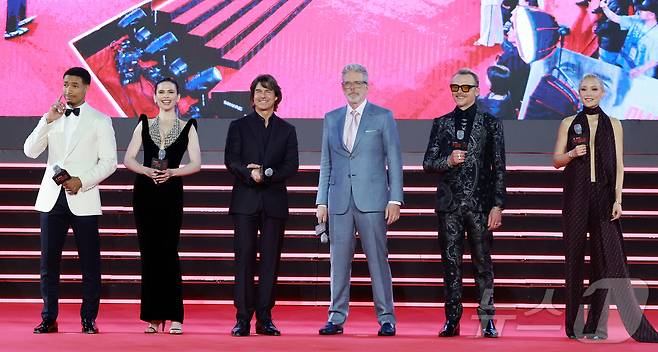 할리우드 배우 그렉 타잔 데이비스(왼쪽부터), 헤일리 앳웰, 톰 크루즈, 스티브 맥쿼리 감독, 사이먼 페그, 폼 크레멘티에프가 8일 오후 서울 송파구 롯데월드 아이스링크에서 열린 영화 '미션 임파서블: 파이널 레코딩' 레드카펫 행사에서 포즈를 취하고 있다.