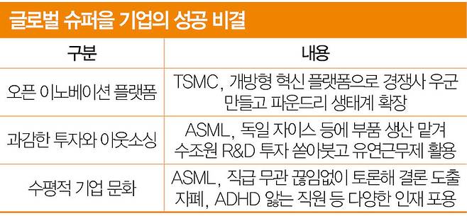 ASML이 슈퍼을 기업으로 안착한 비결로 과감한 아웃소싱 전략을 빼놓을 수 없다. 초정밀 광학과 레이저, 소프트웨어 등 다양한 첨단 기술이 융합된 노광 장비 생산에 집중하기 위해 부품은 70여개 공급 업체에서 30만개를 제공받는다. ‘모든 걸 잘할 수 없다’는 생각에 더 잘할 수 있는 협력 업체가 있다면 미련 없이 그들에게 맡긴다.