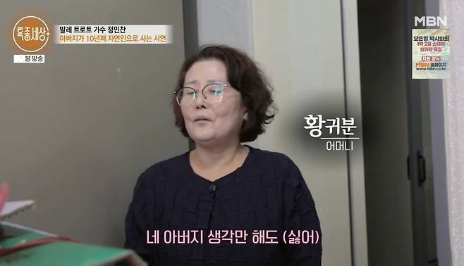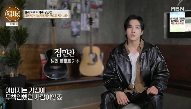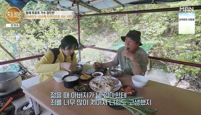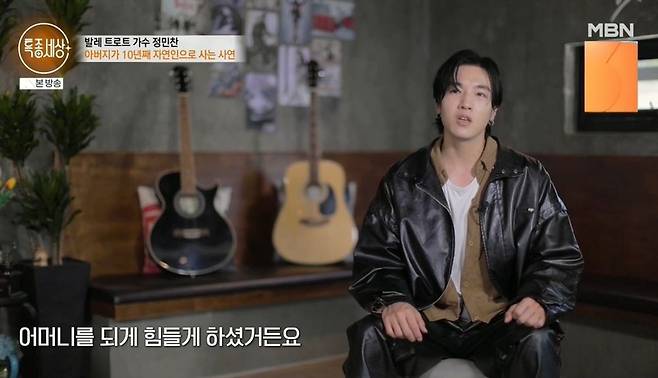 정민찬이 가수에 도전하면서 냉랭했던 부자 사이가 가까워졌다고. 정민찬은 "10년이나 혼자 있으면 안 힘드나"라고 묻자 아버지는 "몸은 힘들어도 마음은 편하다. 엄마한테 미안하고. 젊을 때 아버지가 네 엄마한테 죄를 많이 지어서 너희도 고생했지"라고 후회했다.