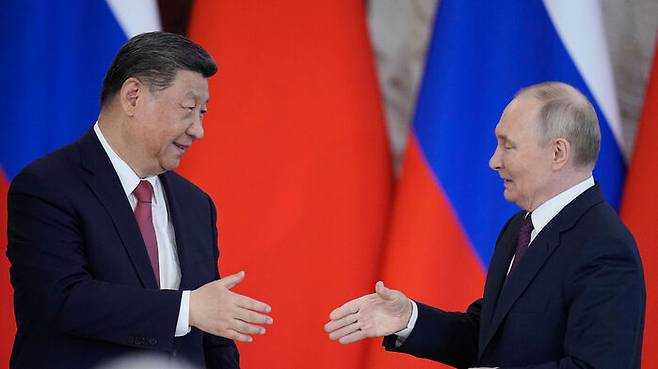 ▲ 러시아 모스크바 크렘린궁에서 열린 정상회담 후 블라디미르 푸틴 러시아 대통령(오른쪽)과 시진핑 중국 국가주석이 서명식에 참석하고 있다.