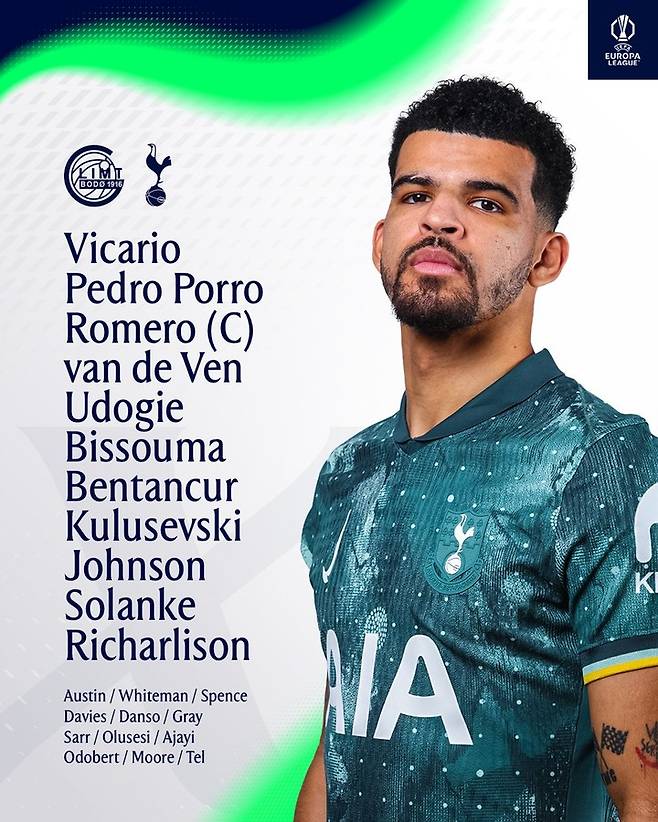 다만 '캡틴' 손흥민이 발 부상에서 완전히 회복하지 못해 이번 경기 출전 명단에서도 제외됐다. 부주장을 맡고 있는 제임스 매디슨은 무릎 부상으로 시즌 아웃이 될 것이라는 소식이 전해졌다.