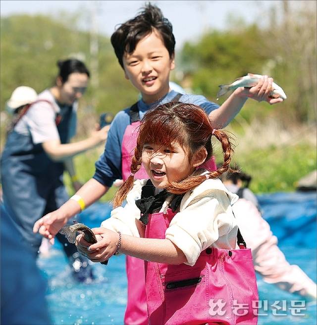 4일 경기 양평 수미마을이 여름을 앞두고 진행하고 있는 ‘메기수염축제’를 찾은 어린이들이 즐거운 한때를 보내고 있다. 농림축산식품부는 최근 이곳을 포함한 전국 20개 마을과 그곳에서 진행하는 프로그램을 가정의 달인 5월에 방문하기 좋은 농촌여행코스로 추천했다.