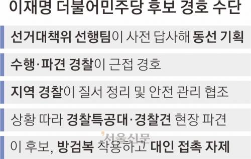 실제로 선대위 내부에서는 현장 행보를 선호하는 이 후보가 소규모 지역 위주의 전국 순회 일정을 잡자 안전 문제로 반대하는 목소리도 나왔다고 한다. 선대위 관계자는 서울신문과의 통화에서 “지난 20대 대선이나 총선 때보다 경호 인력이 늘고 경호 수준도 훨씬 강해졌다”고 말했다.